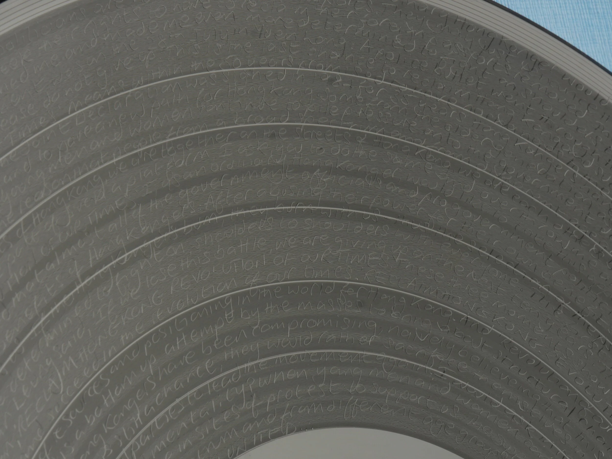 The record often functions as a site of resistance for both groups and individuals and has become a powerful, iconic symbol of our journies through life. In this piece I brought together the music of Roman Tam and a speech which was a call to action for the recent pro-democracy protests in Hong Kong. In carving the record I instantiate the tensions inherent in political struggle, between the past and present and between the ideal and the reality, between ideologies and their associated positions. We are living through a time of deep fractures and fissures between belief systems, divisiveness in communication, a constant search for consensus, open disputes over morality, the direction of humanity and a worrying redrawing of the political, cultural, and social norms. These divisions are fuelled by the digital sphere and its concomitant behavioural changes in communicative structures. This work is symbolic of these fissures, interruptions, fractured truths, interuptions, noise and a smashing of the signal. The crushing of the groove in this instance could be read as the inability of two voices to speak the same lanuage. A whole world of belief encapsulated in the speeches and sound of hope and freedom, being twisted into a broken message, that increasingly becomes more difficult to apprehend as the channel for its communication is ripped, cut and shattered. This work represents an attempt to translate some of these tensions on the taboo surface of this redolent object and its ‘cracked’ surface. The protests are an important moment in the history of democracy, a moment which should be supported by all those who value the human rights and the rights of people to hold their leaders to account.